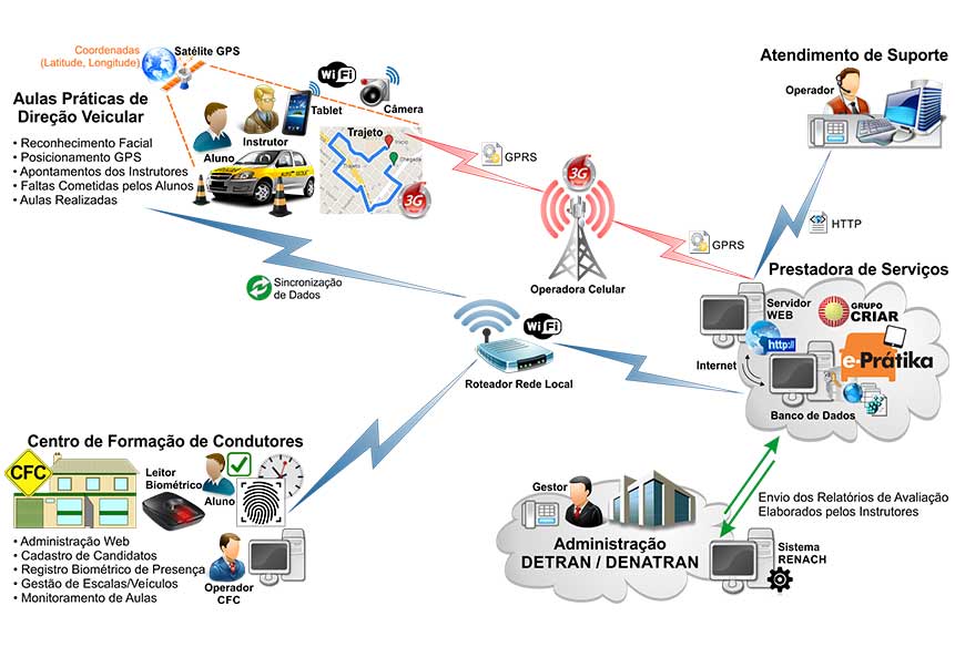 O sistema conta com ferramentas tecnológicas que estão amplamente difundidas em nosso dia a dia, como os dispositivos móveis (tablets), que serão utilizados para coleta de dados pelos Instrutores durante as aulas práticas, e dispositivos GPS para registro automático de todo o trajeto e distância percorrida durante as aulas.